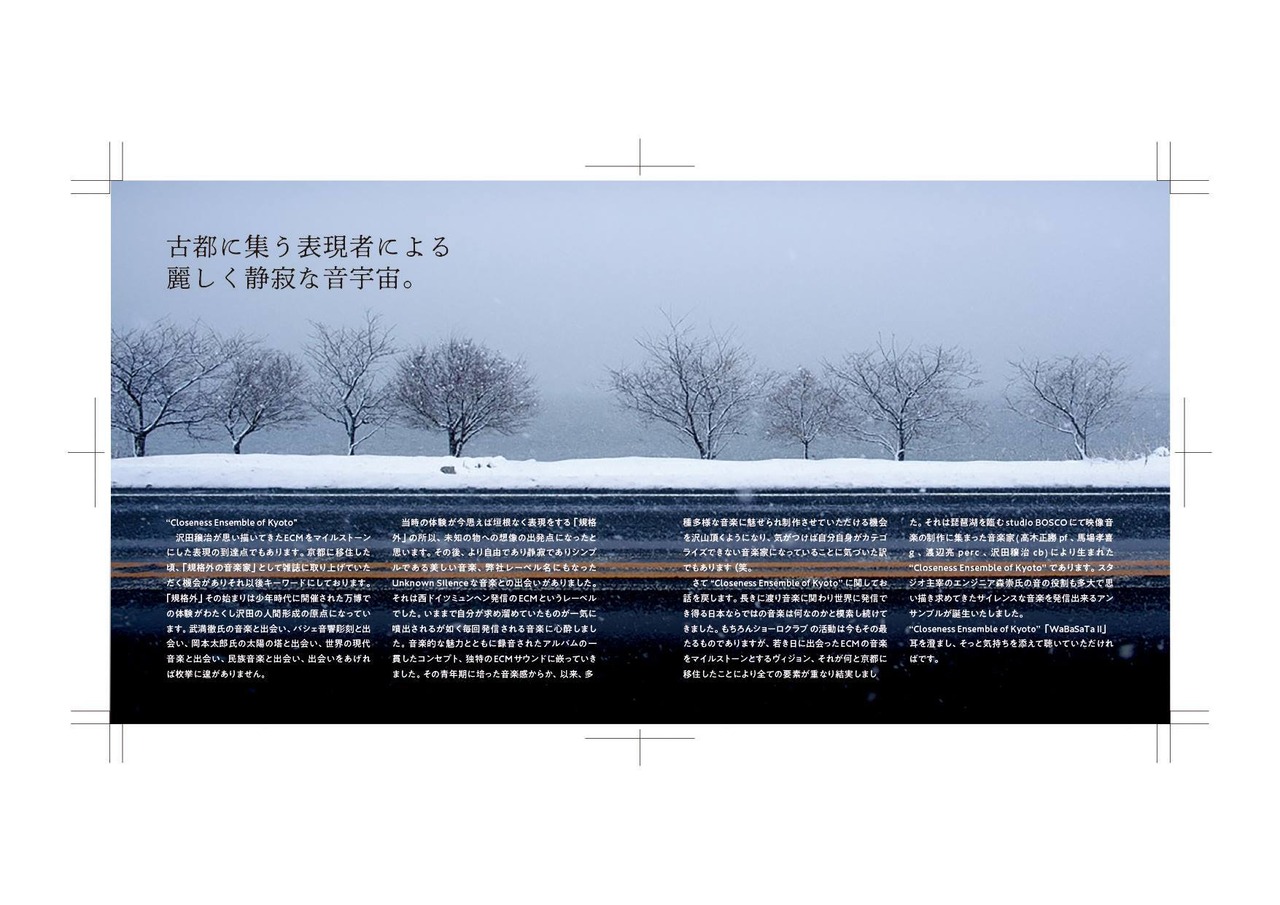 “Closeness Ensemble of Kyoto”沢田穣治が思い描いてきたECMをマイルストーンにした表現の到達点でもあります。京都に移住した頃、「規格外の音楽家」として雑誌に取り上げていただく機会がありそれ以後キーワードにしております。「規格外」その始まりは少年時代に開催された万博での体験がわたくし沢田の人間形成の原点になっています。武満徹氏の音楽と出会い、バシェ音響彫刻と出会い、岡本太郎氏の太陽の塔と出会い、世界の現代音楽と出会い、民族音楽と出会い、出会いをあげれば枚挙に遑がありません当時の体験が今思えば垣根なく表現をする「規格外」の所以、未知の物への想像の出発点になったと思います。その後、より自由であり静寂でありシンプルである美しい音楽、弊社レーベル名にもなったUnknown Silenceな音楽との出会いがありました。それは西ドイツミュンヘン発信のECMというレーベルでした。いままで自分が求め溜めていたものが一気に噴出されるが如く毎回発信される音楽に心酔しました。音楽的な魅力とともに録音されたアルバムの一貫したコンセプト、独特のECMサウンドに嵌っていきました。その青年期に培った音楽感からか、以来、多種多様な音楽に魅せられ制作させていただける機会を沢山頂くようになり、気がつけば自分自身がカテゴライズできない音楽家になっていることに気づいた訳でもあります(笑。